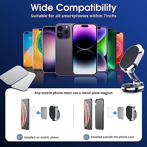 【Universal Compatibility】Made from high-quality compact metal, this magnetic phone holder has a firm grip and can be used in multiple locations in your car, such as the dashboard, instrument panel, and desktop. It is compatible with all smartphones. Compatible with iPhone 14, 13/12/11 Pro Max Mini/ XS MAX / XS /XR/X/8/7/66s Plus and Samsung Galaxy Note 20 10/S10+/ S9/ S8 /S7 /S6, LG Google and more.