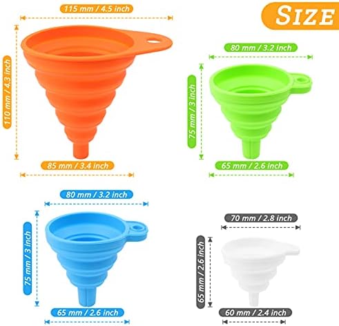 【SPACE SAVER IN KITCHEN】: Collapsible Design, Expand to use, collapse to store the rubber funnels. You can hang on the wall or put away in a drawer. All 4 Silicone Folding Funnel take up less room then 1 regular.