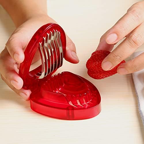 🍓EASY TO OPERATE – you should firstly open the lid, then put your strawberry into the strawberry-shaped groove, gently press down the lid to produce an even slicing effect, finally take out your fruit slices from the fruit slicer and place them into the dish