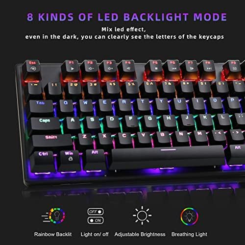 [Hybrid LED Backlit Keyboard]This mechanical gaming keyboard with hybrid led backlight with 8 different lighting modes and effects, 5 levels of backlit brightness and move speed. The double-shot injection keycaps provide crystal-clear backlightin. Even if you use the keyboard in the dark, you can see the letters clearly.