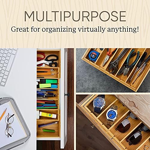 BECOMING MORE EFFICIENT IN THE KITCHEN – This bamboo kitchen cutlery organizer in drawer will take the searching out of every meal. Whether you’re cooking or setting the table, everything you need is right there waiting for you. Try using it in that dreaded gadget drawer which is a staple of every kitchen. Find at a glance, all those fun and useful gizmos and tools that you’ve purchased and forgotten about. Keep clean with only a wipe of a damp cloth.