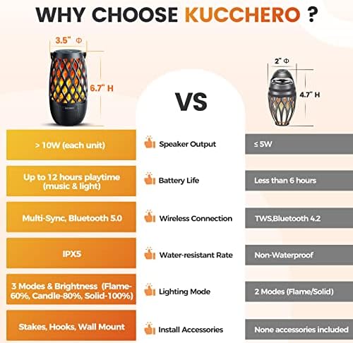 Built-in new upgrade lithium-ion rechargeable battery, KUCCHERO outdoor speaker offers music up to 12 hours per charge and lasts over 24 hours as a table lamp, creating natural & realistic flames, which is perfect for outdoor / indoor decoration.
